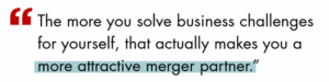 A shift in mindset is essential for any leader navigating the merger conversation. The most effective approach is to focus on what can be controlled: building strength, driving progress, and creating momentum from within. There’s far more control over the outcome when the emphasis is on internal growth rather than relying on the hope that the perfect partner will appear.